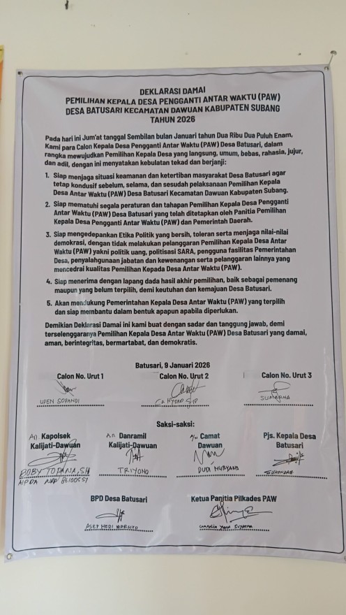 Tiga orang kandidat calon kepala desa PAW yang lolos dari tes tulis yang diselenggarakan oleh kampus Universitas Subang saat ini sedang melaksanakan tahapan selanjutnya yaitu pengundian No Urut Calon Kepala Desa pengganti Antar Waktu (PAW) Desa Batusari yang diadakan di aula desa batusari pada tanbgal 09 januari 2026.